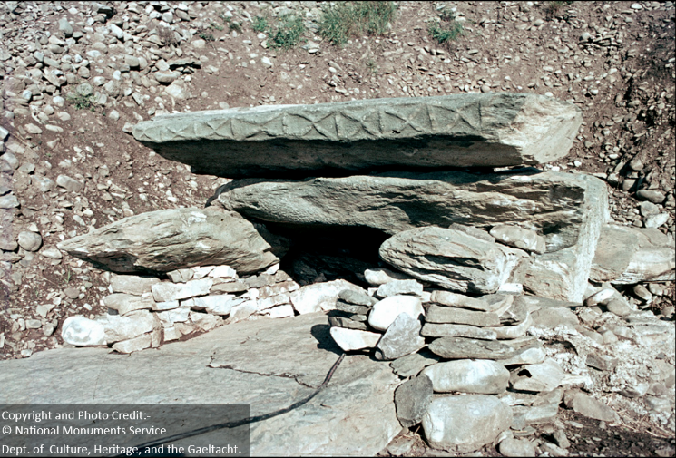 O’Kelly did explain, however, that the former presence of a second block could be inferred from scratch marks on the top rear surface of the first roofslab. He observed that the surviving quartz block showed signs of abrasion on its surface and the scratches on the top of roofslab 1 demonstrated that the block had been pulled in and out of position many times. Similar scratches existed on the other side of roofslab 1, where another block would have been placed. 9